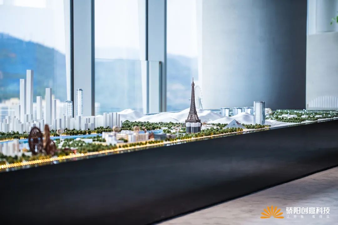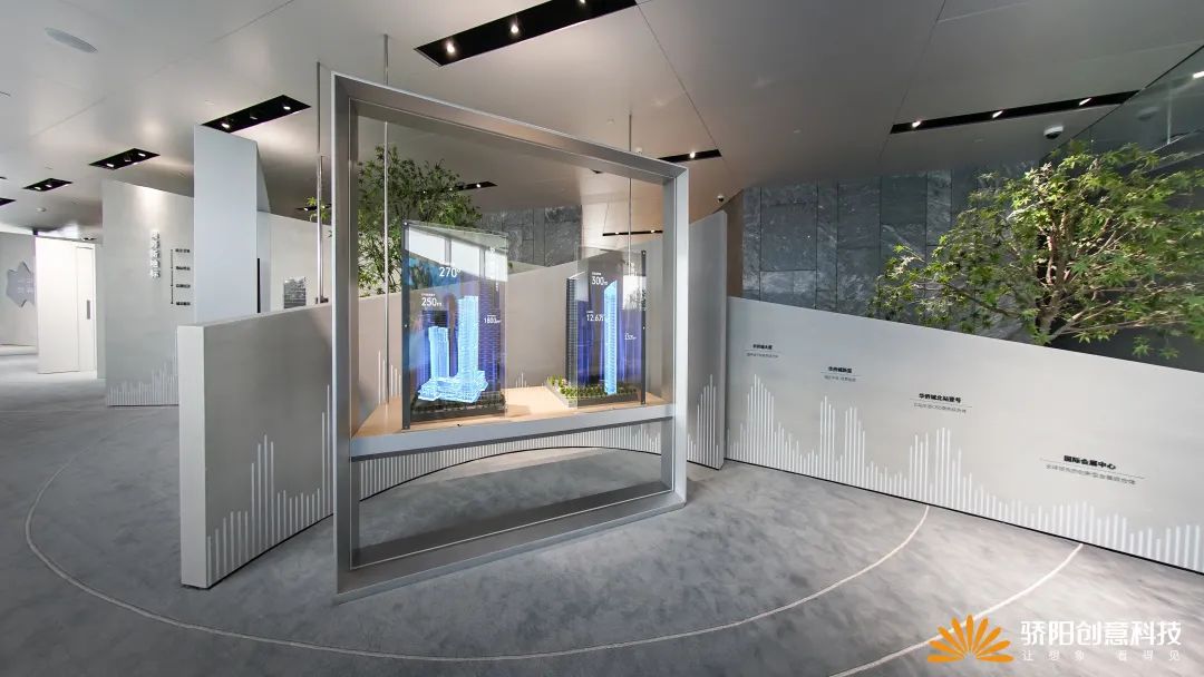 在空間中,我們將商務與標志性建筑做成城市櫥窗,以標志建筑大模型為基礎(chǔ),輔以透明屏,向來訪者展示一座城市的商務封面。