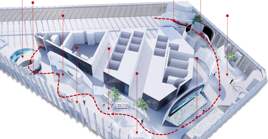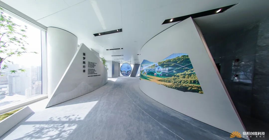 為了凸顯對原生山水的敬重,我們在展示形式上弱化了現(xiàn)代科技的生硬,將科技感隱藏在每一個獨立景觀小品中;在交叉空間處留白、不刻意堆砌展項,空間大開大合,用藝術(shù)氛圍包裹現(xiàn)代科技。