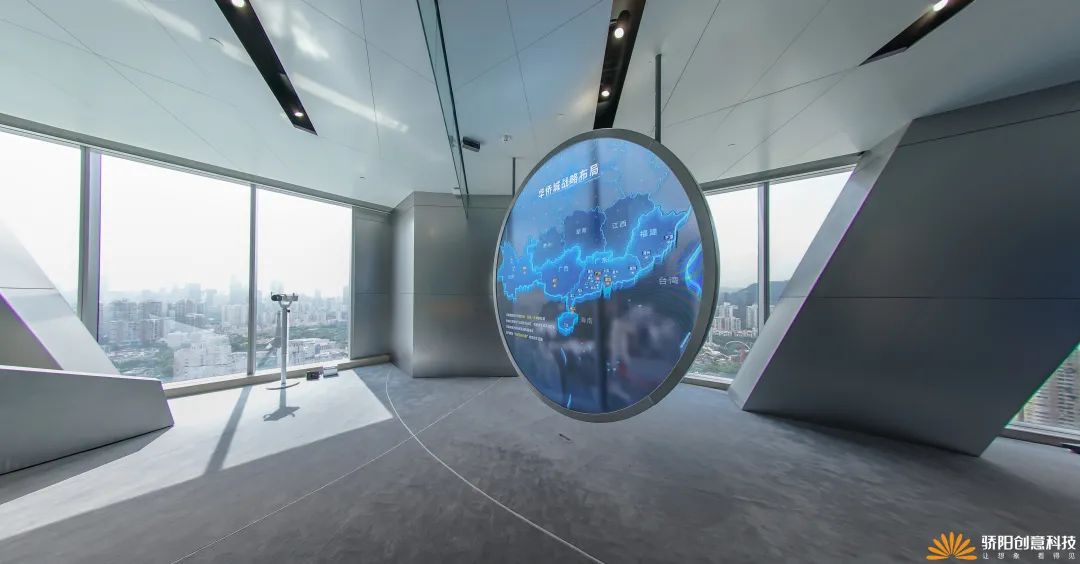 展館所處的這棟華僑城大廈,佇立在深南大道邊上,北望歡樂谷,南瞰深圳灣,西臨科技園,東承福田核心區(qū);展館位于30樓,擁有華僑城總部片區(qū)360度景觀視野,正是展館展示內(nèi)容的實景補充;因此,在本展館所在樓層的一圈落地窗前,我們一共設(shè)置了6臺VR景觀望遠鏡,讓訪客在參觀展館的閑暇之余,感受下華僑城大廈本身所處的整個總部片區(qū)的VR鳥瞰全景。