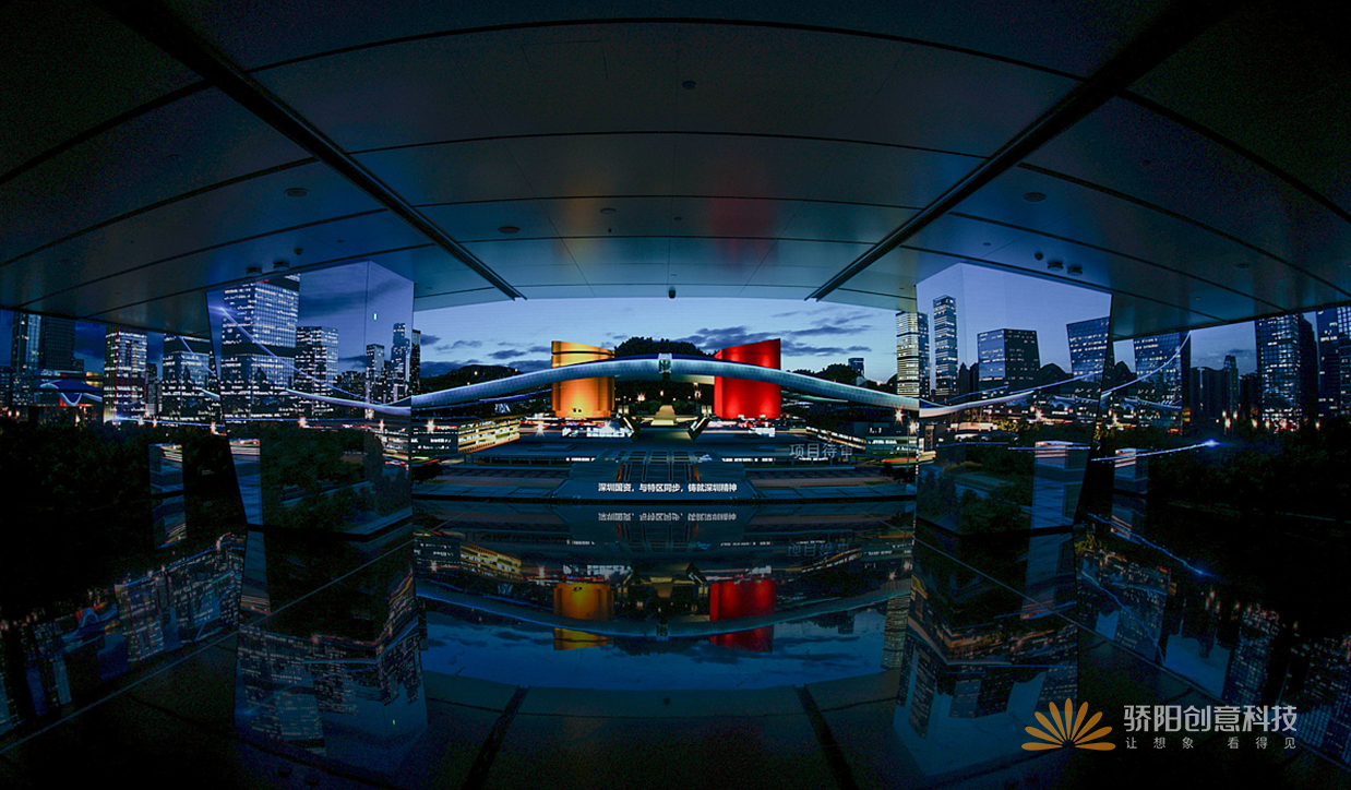 深圳之眼通過高反射天花、半圓環(huán)拼接屏呈現(xiàn)出“圓環(huán)鏡像”效果。